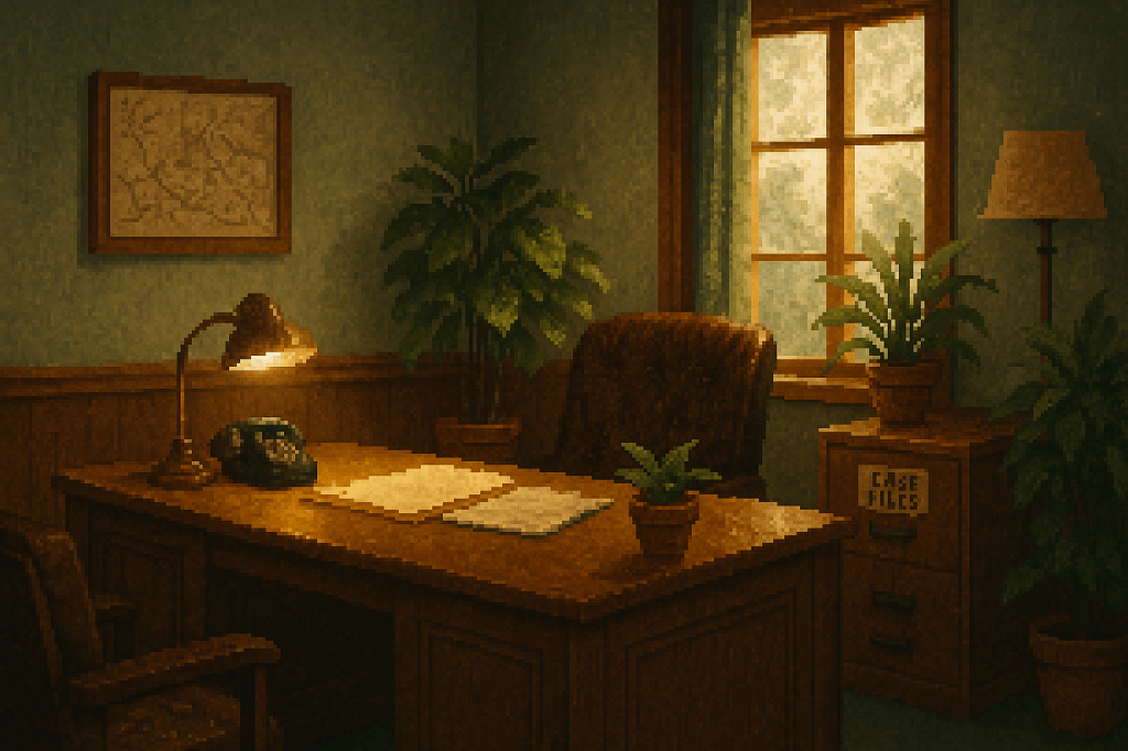 The office felt lived-in. It was functional but personal, like he spent long nights here often. There was a worn leather chair sitting across from his desk, and a few green, leafy plants scattered throughout. A map of Ashford Hollow hung on the far wall, marked with faint red pins.