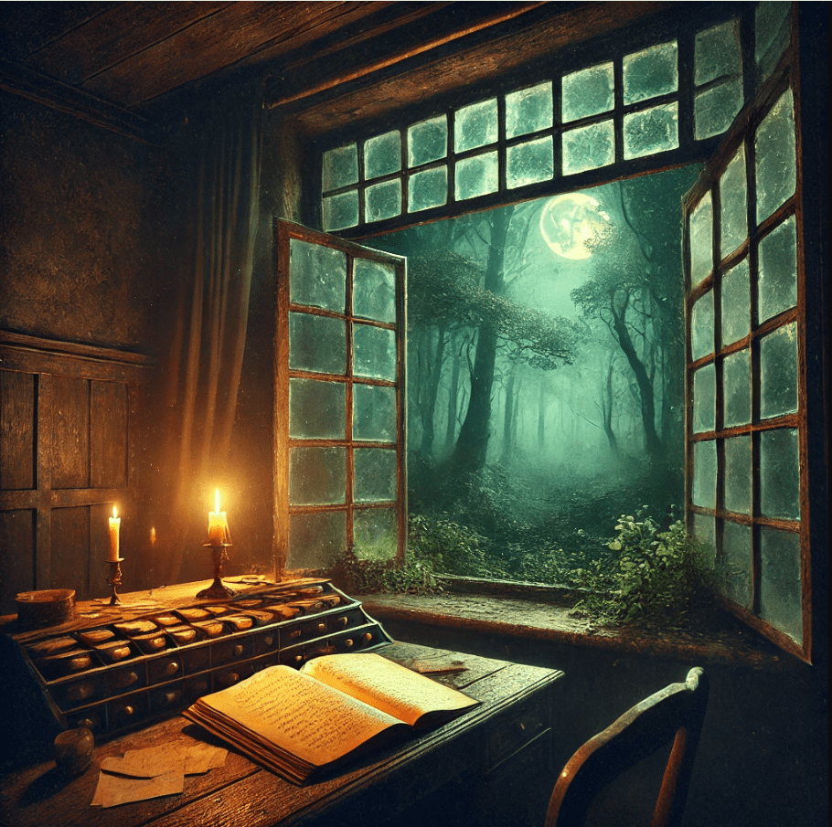 Outside the pane-glass window, the wind sighs through the trees, sending ripples through the moonlit canopy as shifting branches dance across the walls. A flickering candle casts long shadows across the worn wooden desk, its flame moving to the rhythm of a story yet to be told. Before it, The Moonlit Novella lies open, its pages waiting to capture the whispers of the unknown, the echoes of things unseen, the breath of something watching from just beyond the veil.